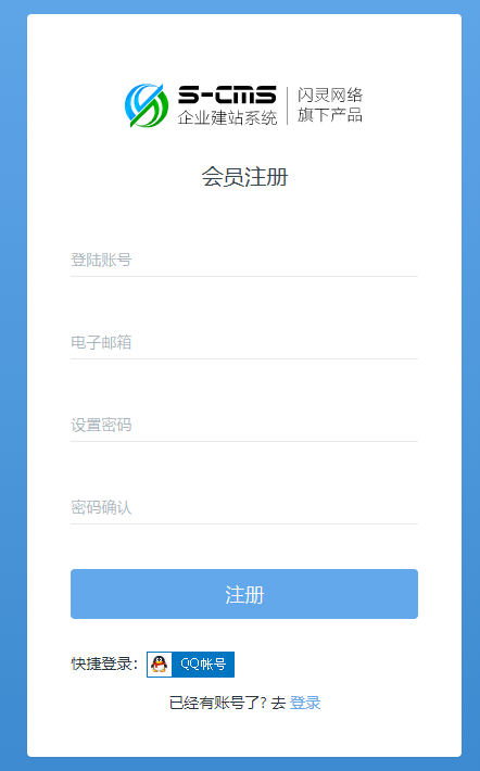 需要填写用户名,邮箱,密码即可注册S-CMS的会员账户。