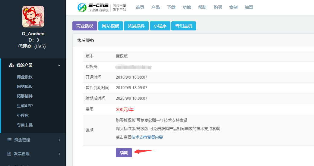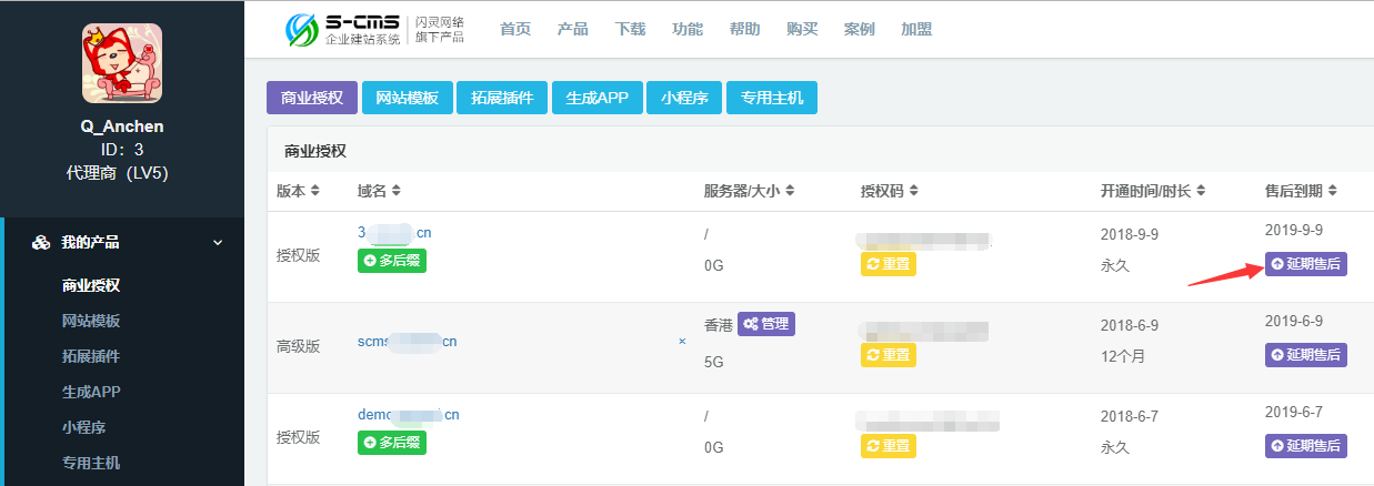 2.点击“我的产品”-“商业授权”,就可以看到售后到期时间