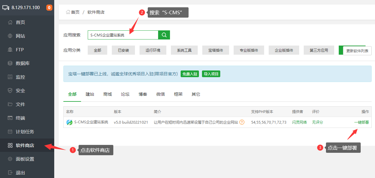 软件商店 -> 应用搜索 S-CMS ,应用分类 一键部署